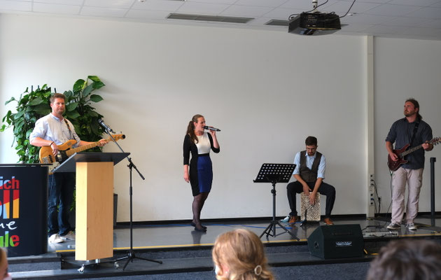 Wie schon im letzten Jahr wurde die festliche Verabschiedung von der Lehrerband musikalisch umrahmt. Begleitet von Kim Reefschläger (E-Bass), Falko Schulze (E-Gitarre) und Dominik Steiner (Trommel) sang Cathrina Braun u. a. ,,Geile Zeit“ von Juli. Dass die Zeiten während ewig scheinender Museumsbesuche, unbequemer Übernachtungen im Freien oder langweiliger Vorbereitungen im Unterricht nicht immer ,,geil“ waren, machte Britta Stehle in ihrem Videogruß scherzhaft deutlich. Doch am Schluss der Veranstaltung schwang auch in diesem Jahr bei den AbsolventInnen, bei LehrerInnen, MitarbeiterInnen und Eltern deutliche Wehmut mit. Fünf bzw. sechs Jahre Heinrich-Böll-Schule fanden an diesem Freitag ein Ende. Doch jedem Ende wohnt ein neuer Anfang inne.