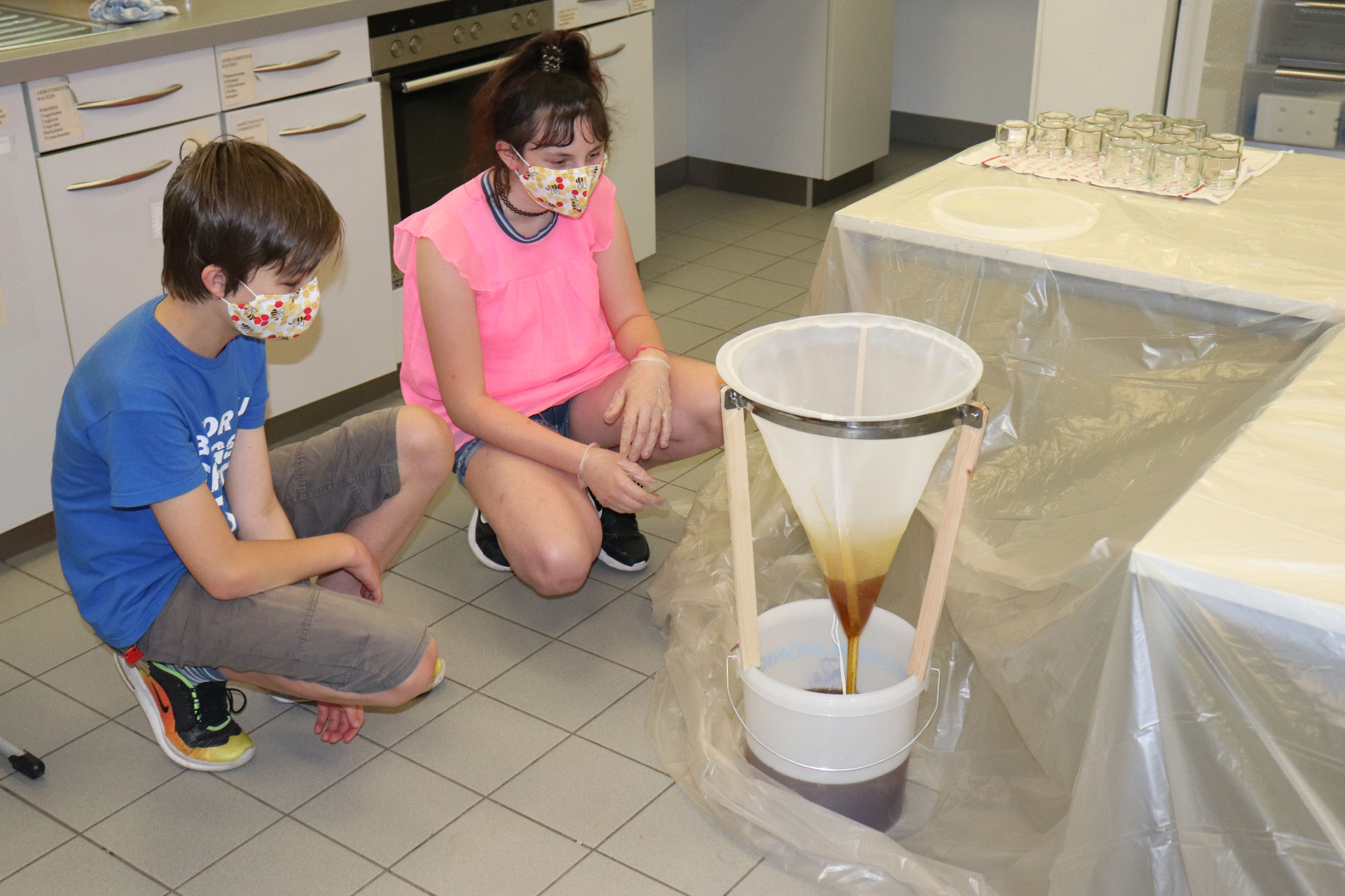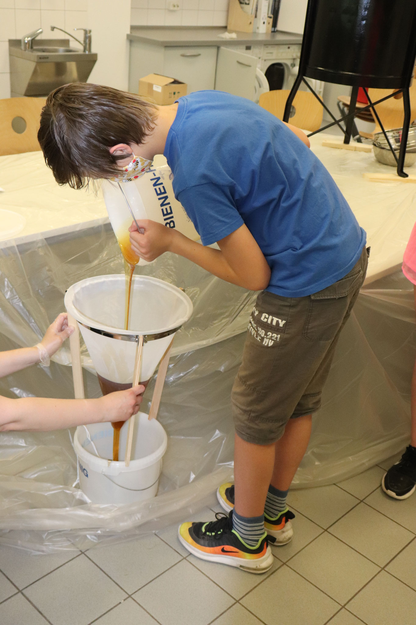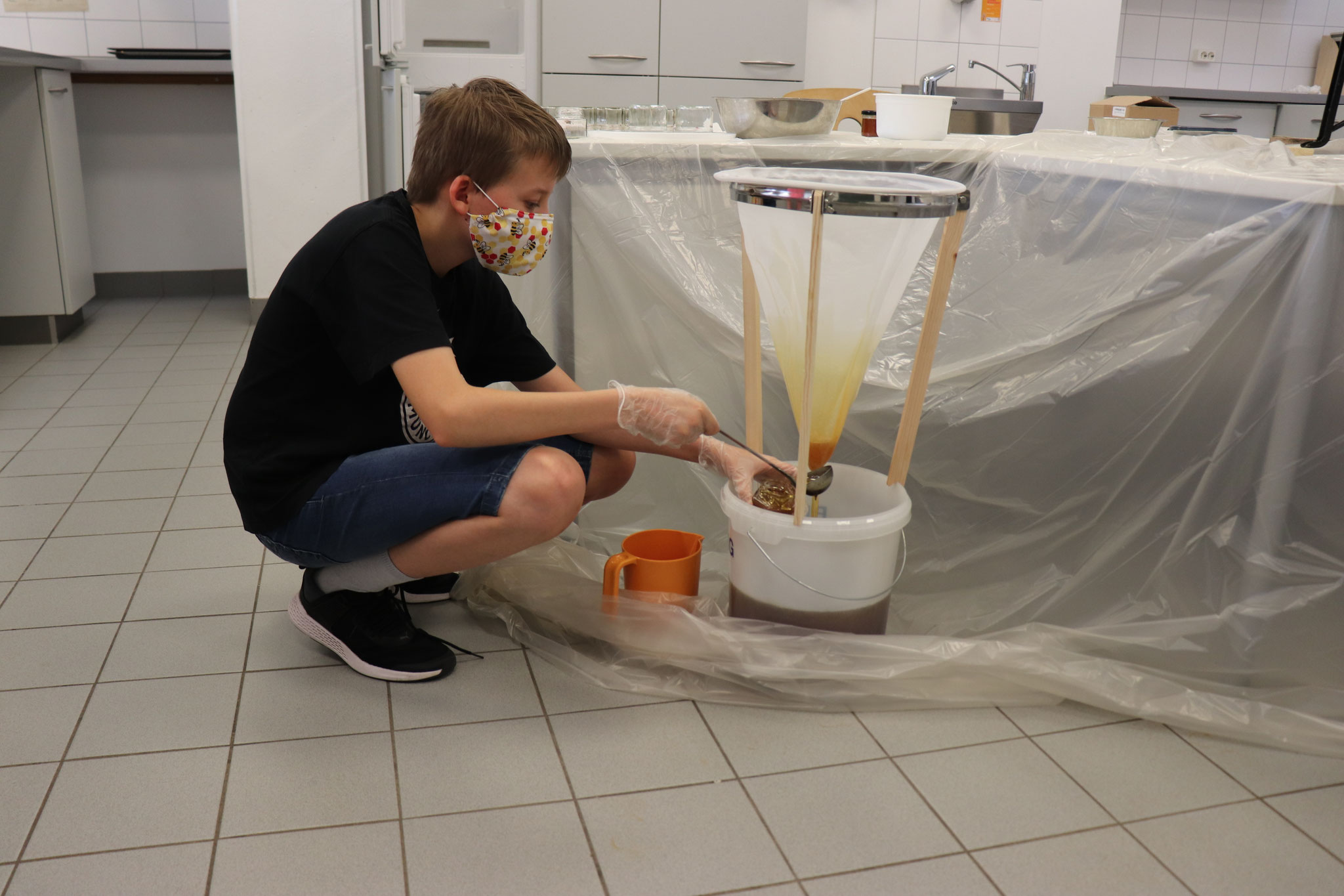 Wir kurbelten und kurbelten und endlich kam unser Honig aus der Schleuder in unseren Eimer geflossen. Anschließend musste er noch einmal gesiebt werden – und schon ging´s ab in die Gläser.