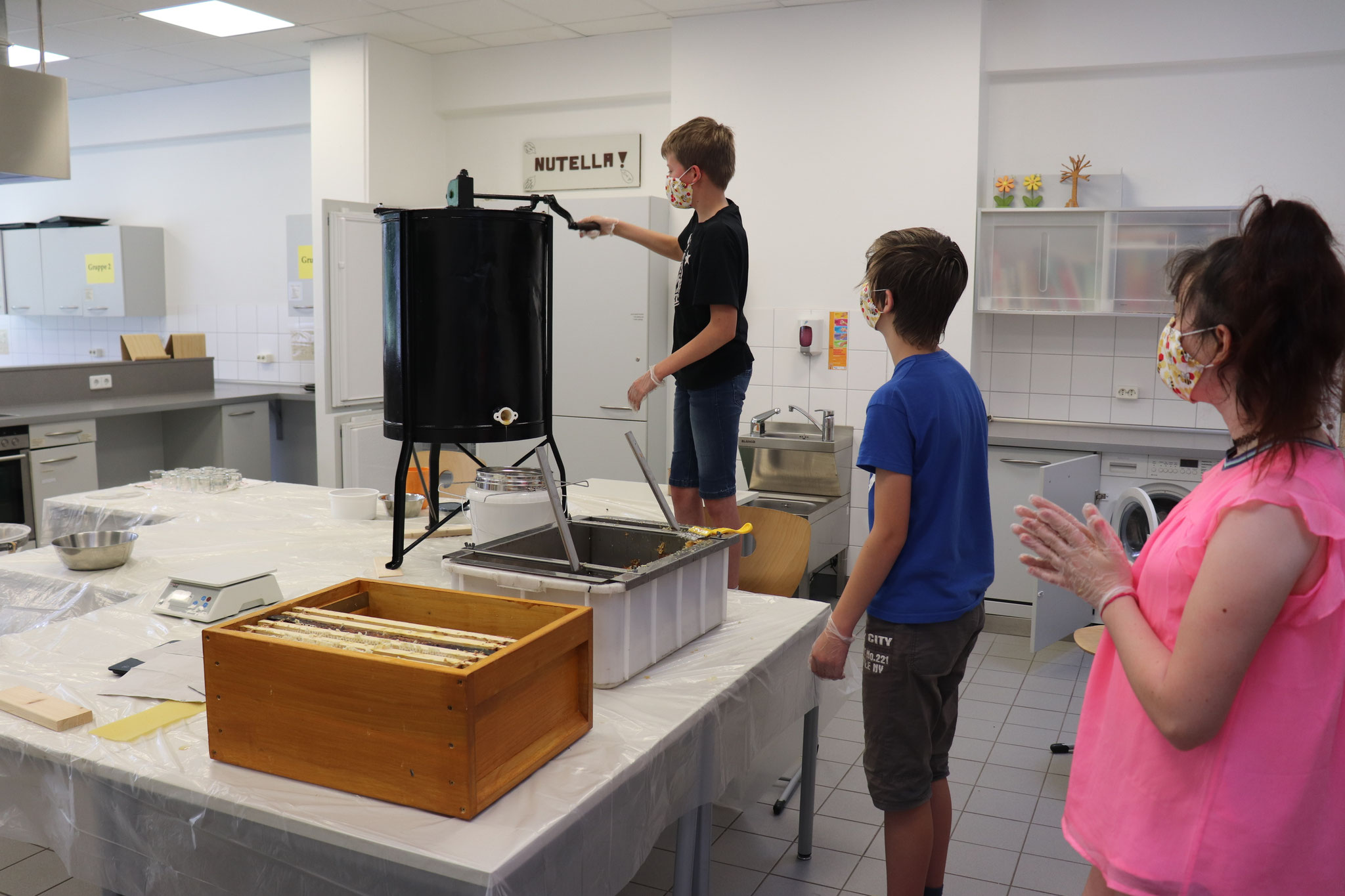 Am 25.06.2020 trafen wir uns als Imker-AG, um den Honig unserer fleißigen HBS-Bienchen zu schleudern. Den Honigraum hatte Frau Dasbach-Hofmann bereits den Bienen stibitzt und in der Schulküche alles Weitere für das Schleudern aufgebaut.
