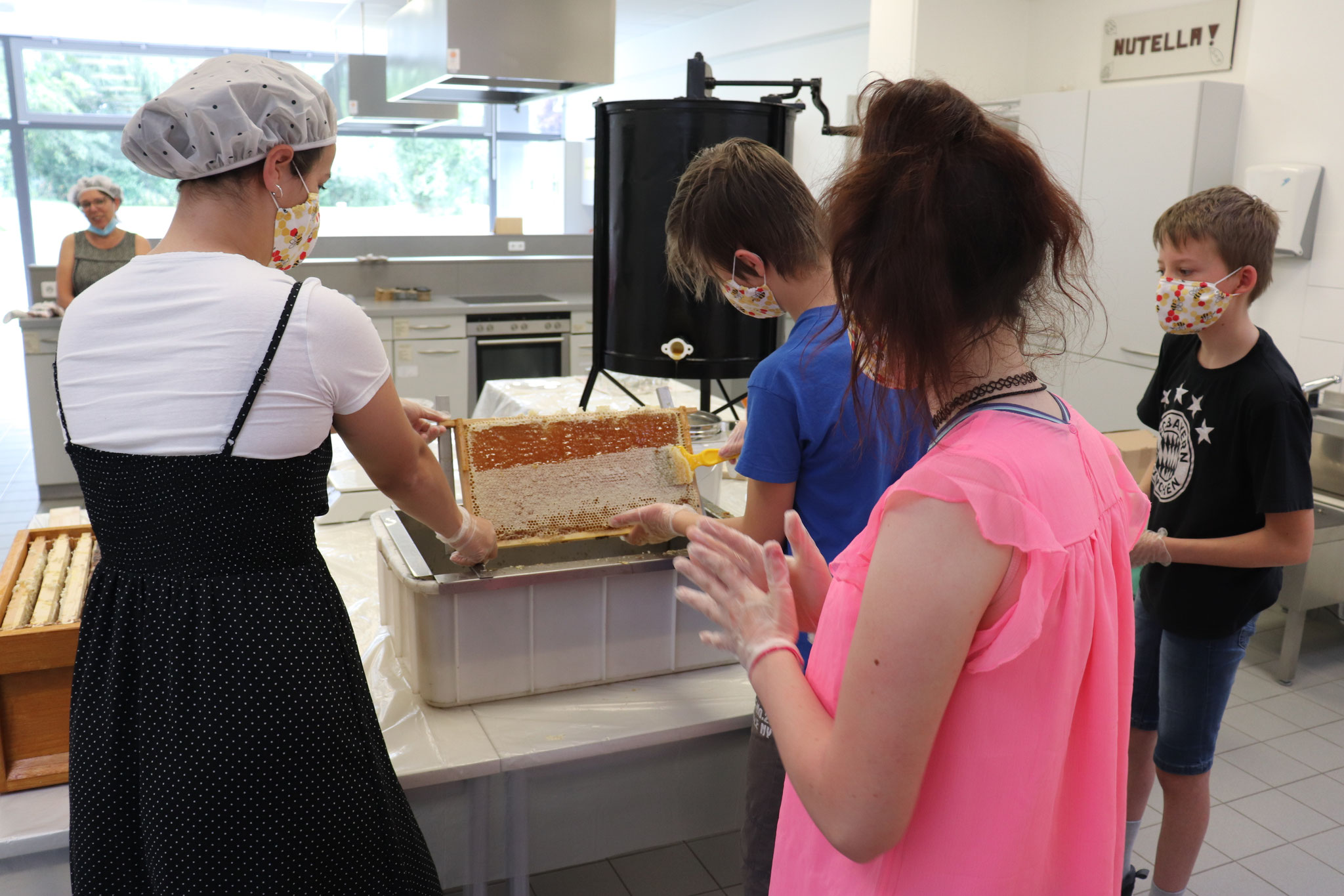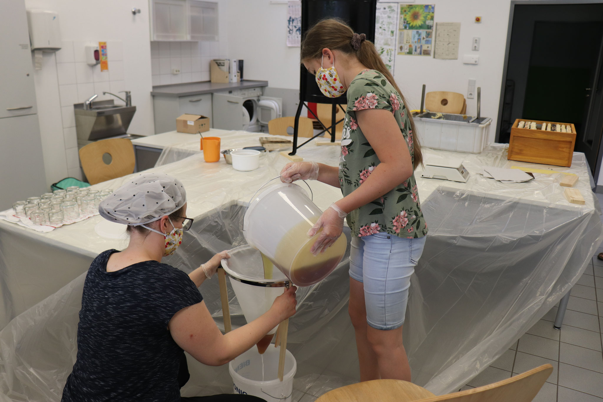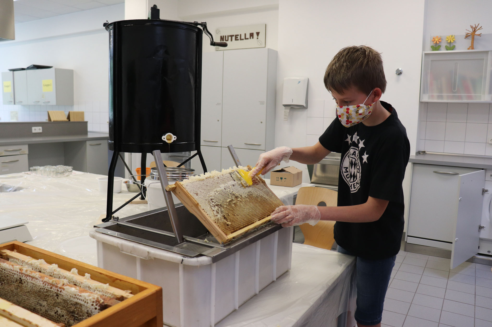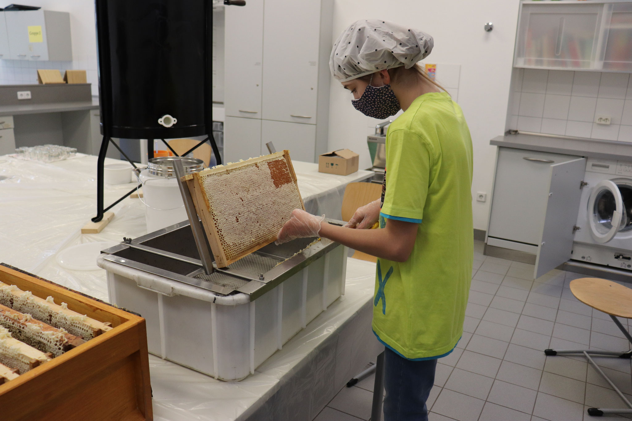 Ausgestattet mit Handschuhen, Hauben und eigens für die AG genähten Mund-Nasen-Bedeckungen gingen wir an´s Werk: Die Wachsdeckelchen mussten entfernt werden, damit der Honig darunter zum Vorschein kam und herausgeschleudert werden konnte.