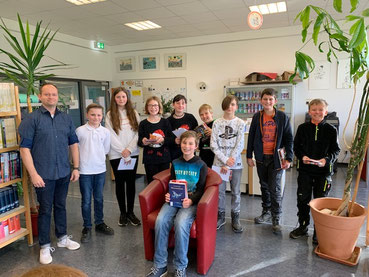 Zunächst wählen sich die Teilnehmer ein Buch aus, präsentieren es in ihrer Klasse und lesen ein Stück daraus vor. So bietet der Vorlesewettbewerb die Gelegenheit, die eigene Lieblingsgeschichte vorzustellen und jede Menge neue Bücher zu entdecken, auszuleihen und zu lesen. Auf diese Weise sind aus fünf sechsten Klassen 96 Schülerinnen und Schüler der HBS gegeneinander angetreten und haben zunächst ihre beiden Klassensieger ermittelt: Christopher Held, Finn Schorlemmer (6a), Ben Götz, Vanessa Ohlmann (6b), Isabell-Sophie Müller, Niklas Schmidt (6c), Zoe Wyschka, Kilian Reis (6d), Elias Bayer, Eva Langer (6e). Am 09.12.2019 fanden sich die Klassensieger und eine Jury, bestehend aus Frau Streb, Frau Korbach (Lehrerinnen), Frau Zeller, Frau Orth (Bücherei-Team) und Kai Renisch (Schulsieger 2018), in der Schulbücherei ein, um den Schulsieger zu ermitteln. Nach zwei Stunden, in denen neben dem selbst ausgewählten Text auch ein Fremdtext möglichst ausdrucksstark und flüssig vorgelesen werden musste, stand fest: Der beste Vorleser in diesem Jahr ist Kilian Reis, der den Fantasyroman ,,Drachenreiter“ von Cornelia Funke vorgestellt hat. Den zweiten Platz belegte Elias Bayer mit „Fünf Freunde - Wettlauf gegen die Zeit“ von Enid Blyton. Die HBS gratuliert dem Sieger und wünscht viel Erfolg für die folgenden Wettbewerbsetappen! Text: Nadine Lorenz